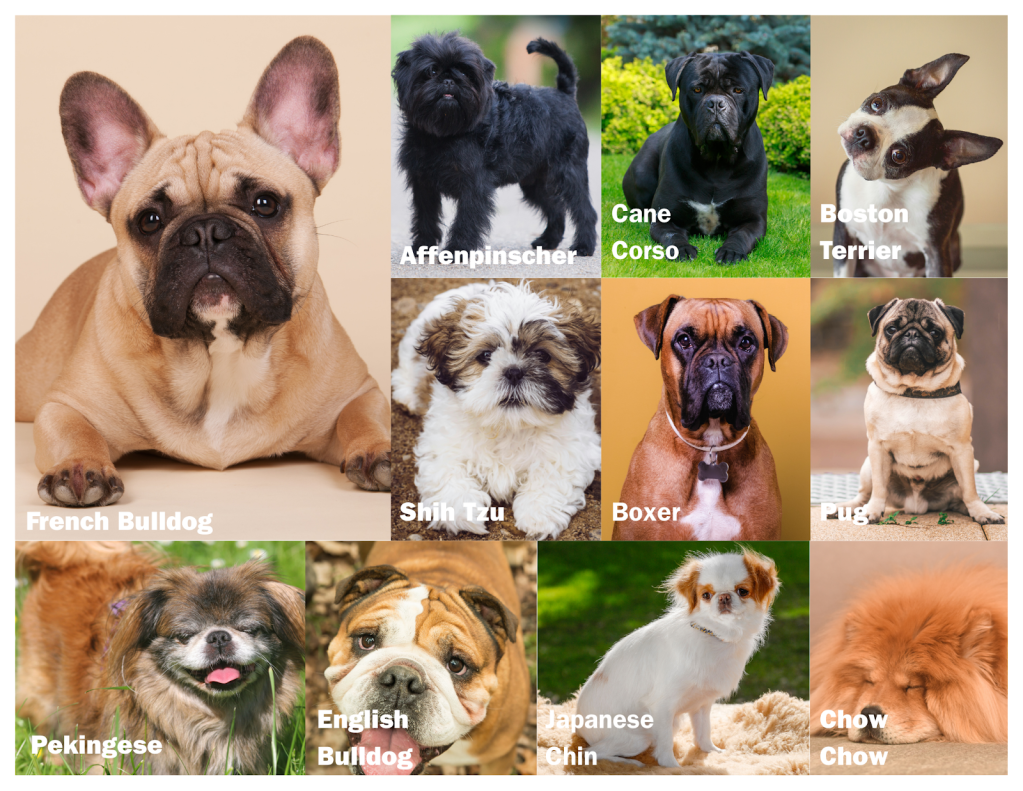 Compressed snouts, faces, and “miniature” features are a result of selective breeding. Brachycephalic (brak-ee-suh-fal-ik) is derived from two Greek roots: brachy-, meaning short, and cephalic, meaning head. Some brachycephalic breeds include, but are not limited to, the French Bulldog, Cane Corso, Boxer, Chow Chow, and Affenpinscher.